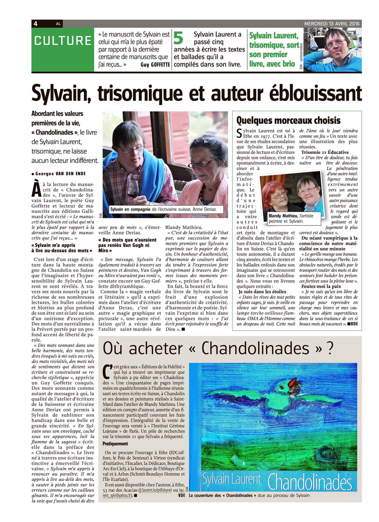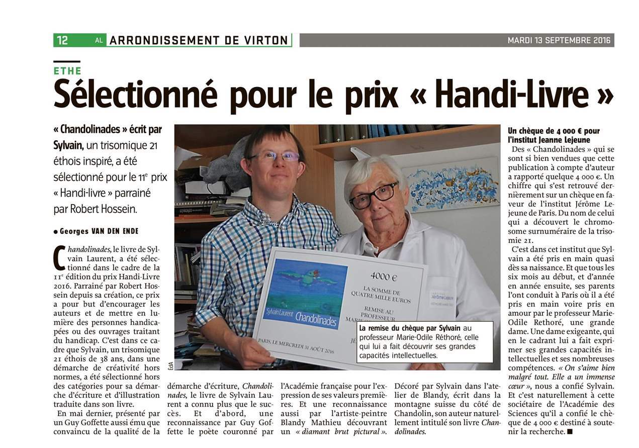 Mon choix s'est porté sur Sylvain Laurent, jeune trisomique bourré de talent et de courage et auteur de “Chandolinades“.